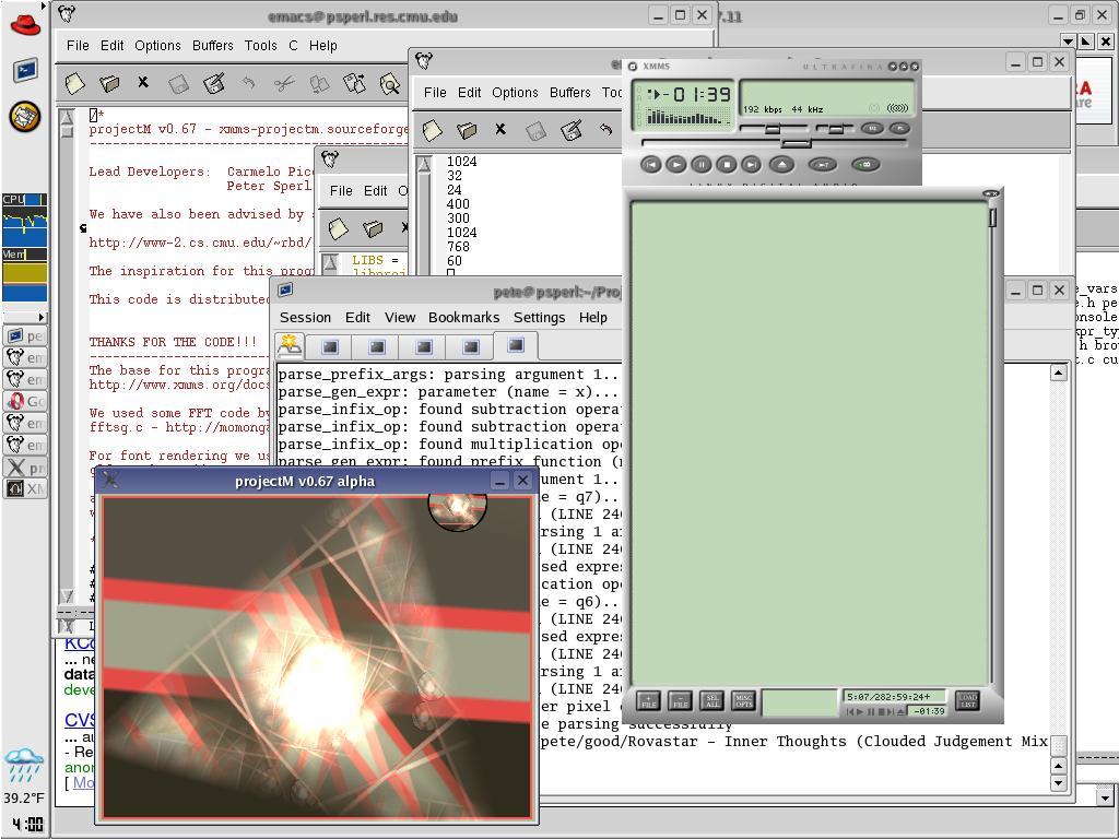 We've moved the projectM config file to ~/.projectM/config, added the ability to close xmms plugins via the window decorations, added song title support for xmms-projectM, and removed the mouse cursor when fullscreened in xmms-projectM. You can thank n0dalus for the mouse cursor, title, and window closing stuff.